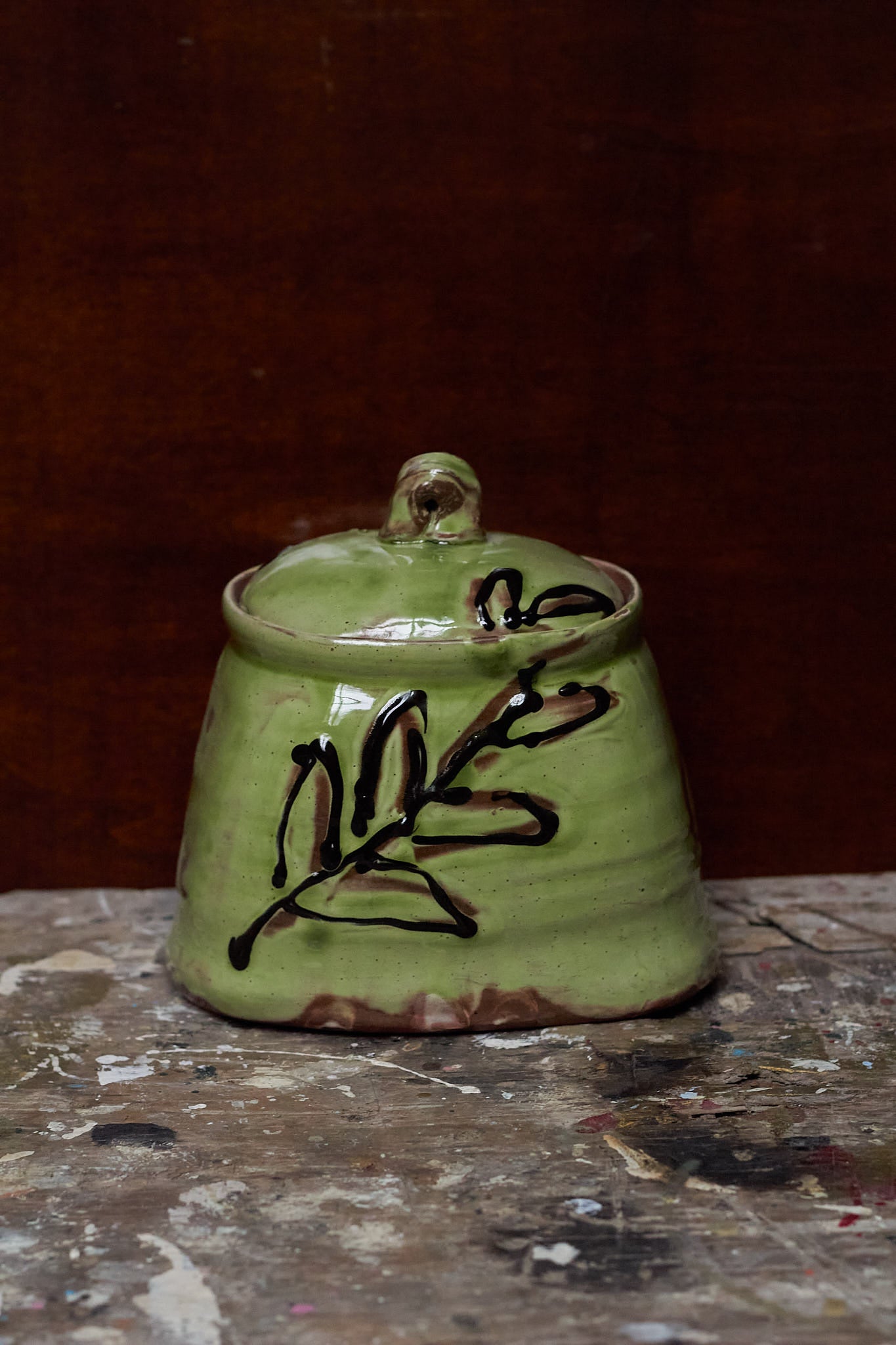 Square jar made from red clay and covered with green slip. Design painted with sliptrailer in black slip. Glazed with transparent glaze.