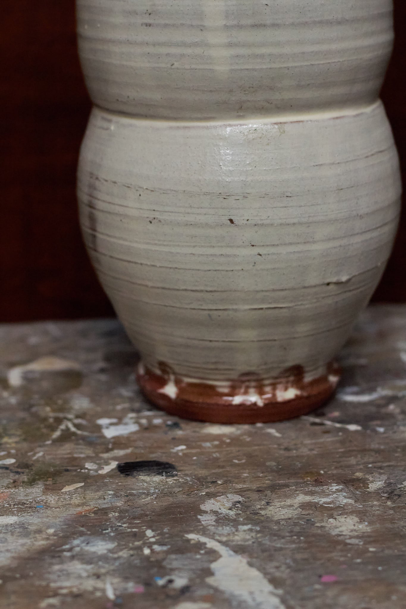 Tall vase made from red clay, covered in white slip. Glazed with a transparent glaze.